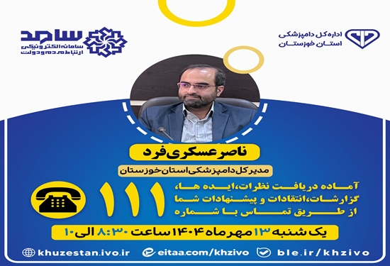 به گزارش روابط عمومی اداره کل دامپزشکی استان خوزستان، ناصر عسکری فرد مدیرکل دامپزشکی استان خوزستان در راستای استمرار تعامل مردم و دولت و پاسخگویی به درخواست ها و مشکلات هموطنان و ایجاد فرصتی یکسان برای همه اقشار جامعه برای ارتباط مستقیم تلفنی با مسئولین و مدیران، در آستانه ۱۴ مهر روز ملی دامپزشکی با حضور در مرکز سامانه الکترونیکی ارتباط مردم و دولت «سامد» و از طریق تلفن ۱۱۱ به سؤالات و مسائل مردم که مرتبط با وظایف این اداره کل باشند پاسخ میدهد.